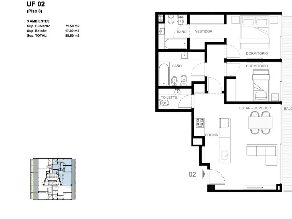 linving comedor con cocina incorporada y tolillete de recepcion -balcon al contrafrente
