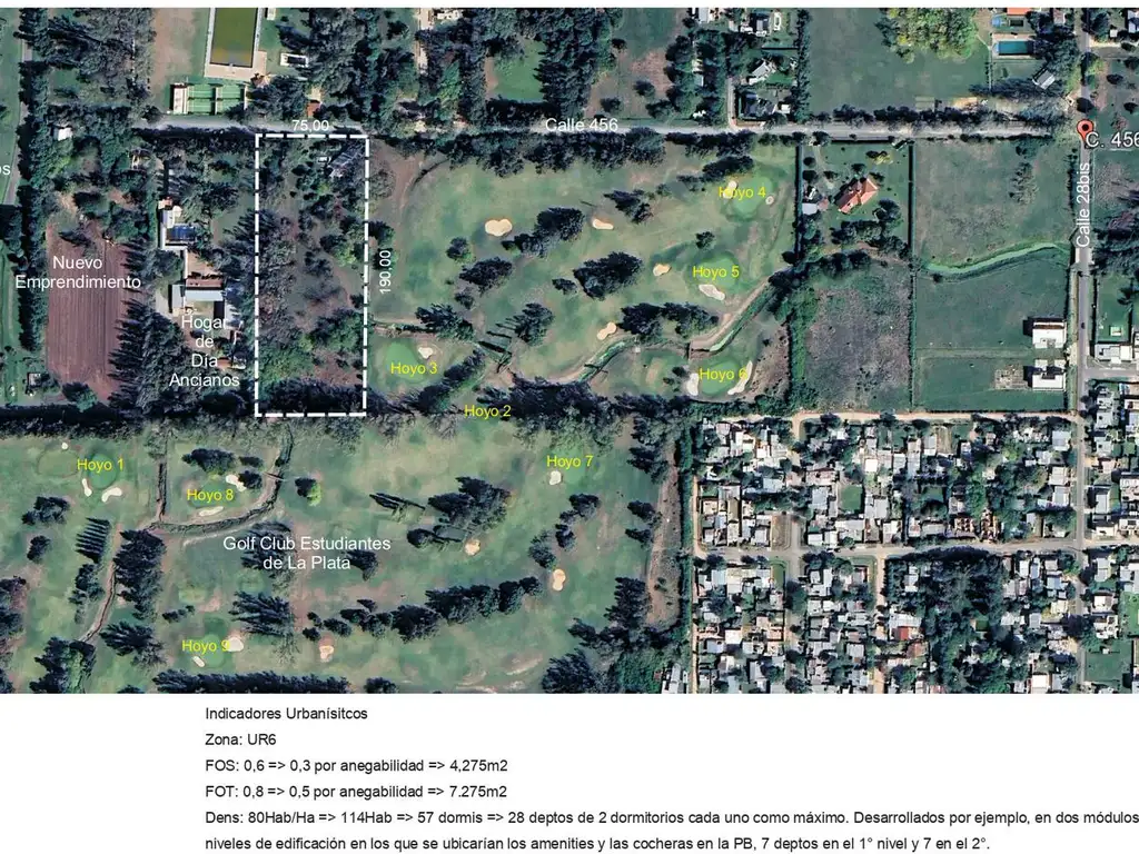 Único terreno, con 265 m que lindan con la cancha de golf del Country de Estudiantes de La Plata. Tiene arboleda autóctona, electricidad y gas. Sobre el inmueble existe un proyecto arquitectónico para construir -de conformidad con la normativa vigente- 29 departamentos, SUM, piletas, cowork, gym y spa, cuenta con naiming, branding y brandbook, Análisis Comparativo de Mercado, presupuestos y demás información inherente al proyecto.