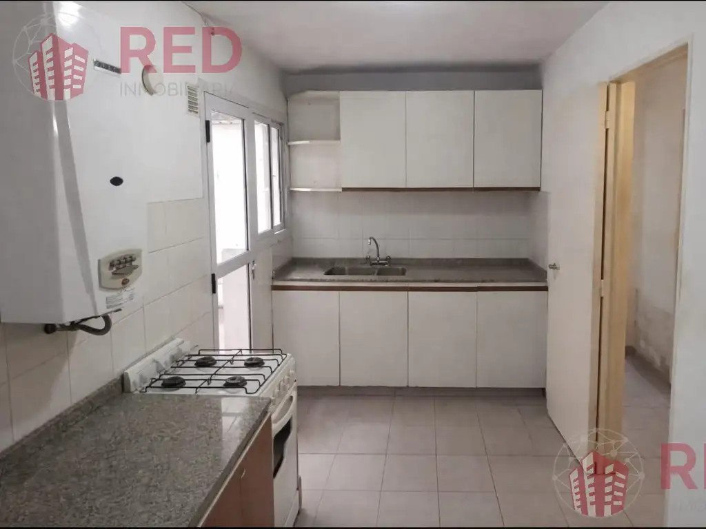 Cocina separada con artefacto de cocina y calefón a gas, con buen espacio de guardado