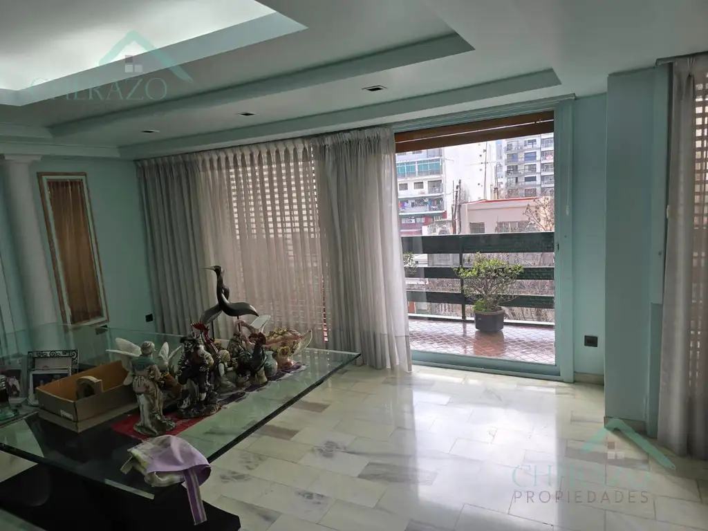 Hermoso living comedor en L con salida al balcón terraza con pisos de mármol pulidos a plomo.