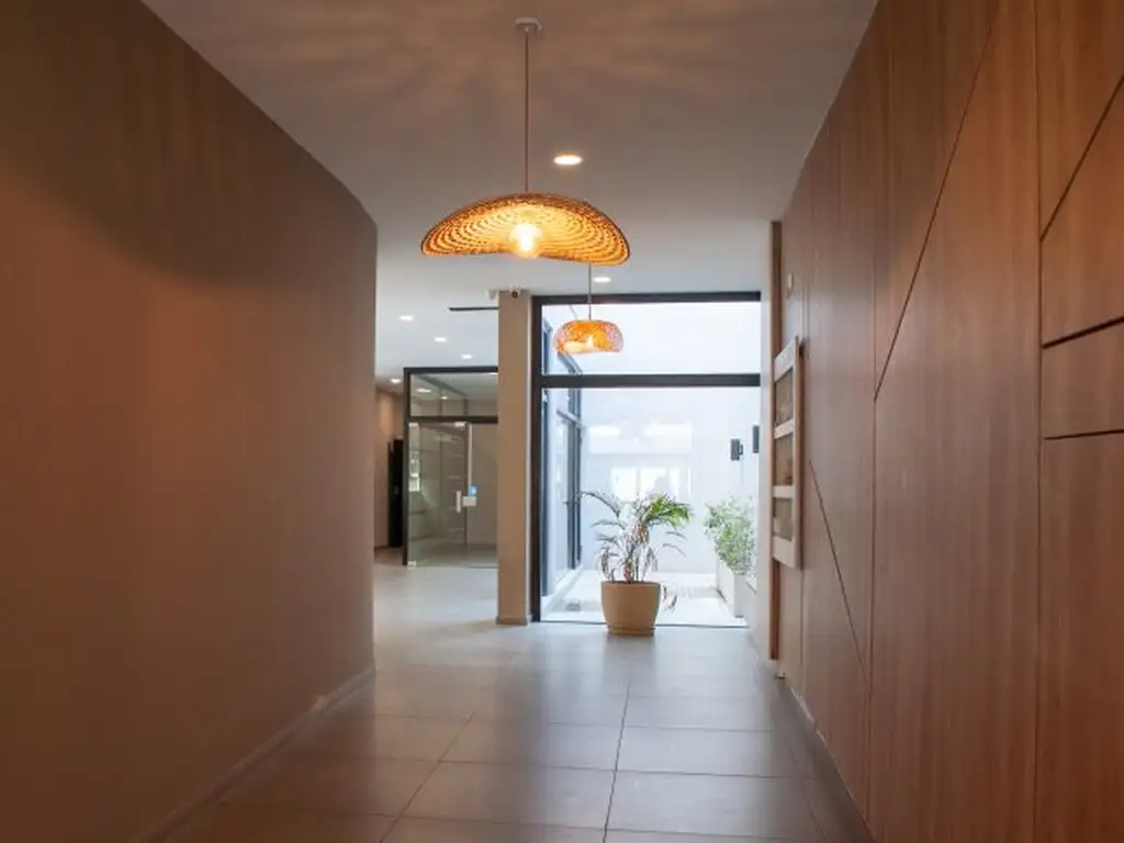 A la unidad se ingresa por un living comedor con cocina integrada ,equipada con muebles de alacena y bajo mesada. Mesada de marmol. Desde el espacio social se accede al patio con cesped sintetico.