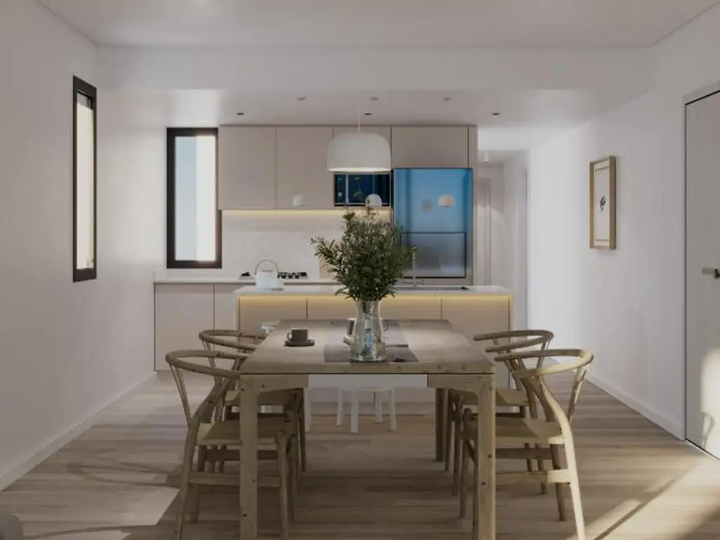 Las cocinas están equipadas con muebles en MDF laminado, mesadas de granito o silestone y bacha de acero inoxidable marca Johnson. Los baños presentan pisos de porcelanato y artefactos sanitarios marca Roca o Ferrum, logrando espacios modernos y elegantes. Los dormitorios cuentan con pisos vinílicos símil madera y frentes de placard en MDF con puertas corredizas.
