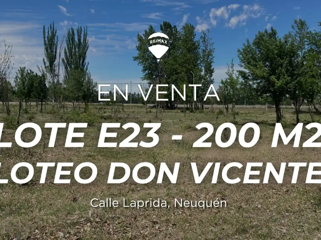 Equipo RE/MAX vende en exclusiva este lote de 200 m² en esquina (Lote E 23), ubicado en el desarrollo Don Vicente, en la ciudad de Neuquén Capital.