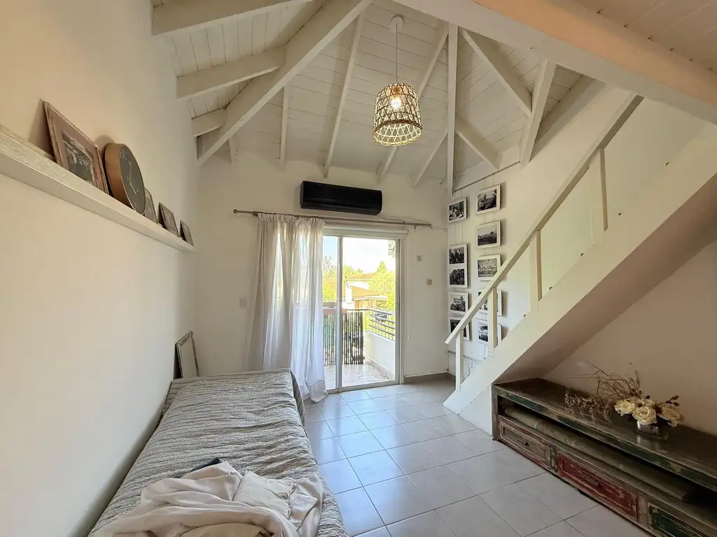 Baño completo con bañera y dormitorio en el entrepiso con vestidor. Preciosa vista al verde.