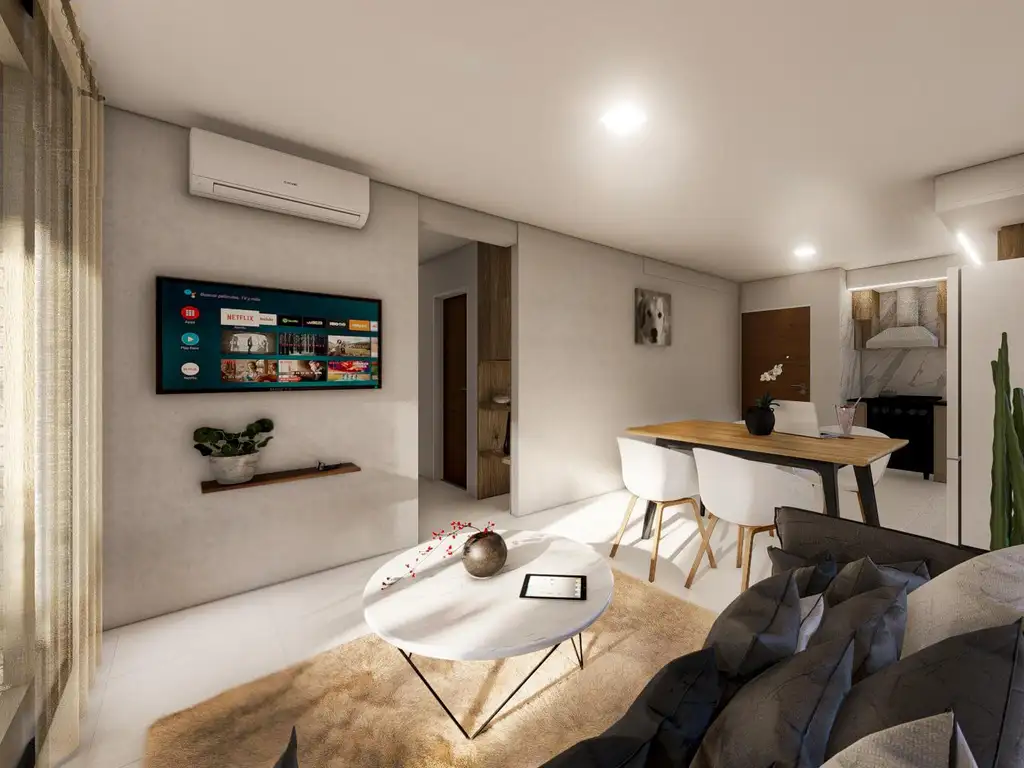 Ingresamos a un amplio living comedor con cocina integrada, diseñado para ofrecer un espacio funcional y bien aprovechado. Este ambiente principal cuenta con salida al balcón, brindando excelente luz natural y ventilación.Dispone de un baño completo. La unidad cuenta con dos dormitorios: uno con placard integrado y el dormitorio principal en suite, con su baño completo privado.
