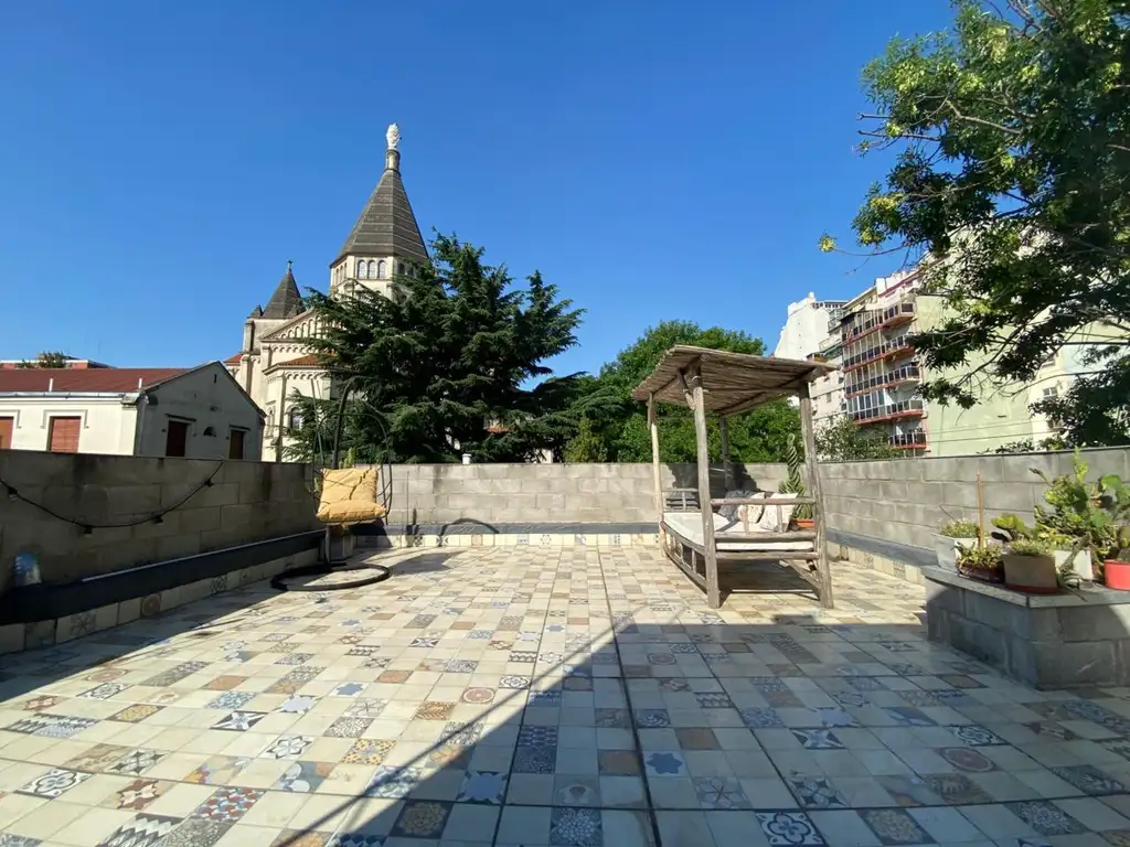 Desde el patio se accede a una amplia terraza propia, un espacio único por su tamaño y privacidad, con pisos calcáreos estampados que le aportan un estilo encantador y muy decorativo, ideal para armar un sector social.