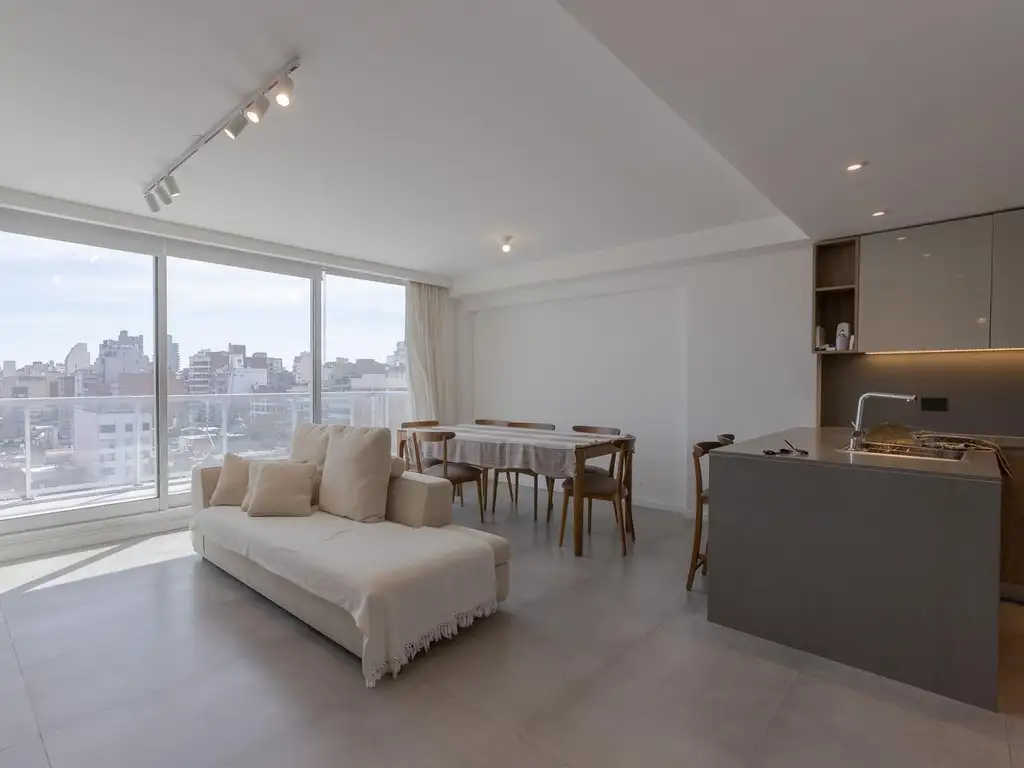 Dos dormitorios. Principal en suite con vestidor. Ingreso por sector social hacia el Norte. Cocina integrada en isla equipada con cava de vinos y mobiliario moderno completo. Instalación para lavavajillas y lavarropas. Barra desayunadora. Sector social de living y comedor con salidas al gran balcón con piel de vidrio corrido al frente y visuales abiertas a la ciudad. Los íntimos con ante baño y baño principal con bañera. Dormitorio con salida hacia el balcón y placares completos. Unidad equipada con mobiliario de diseño personalizado.