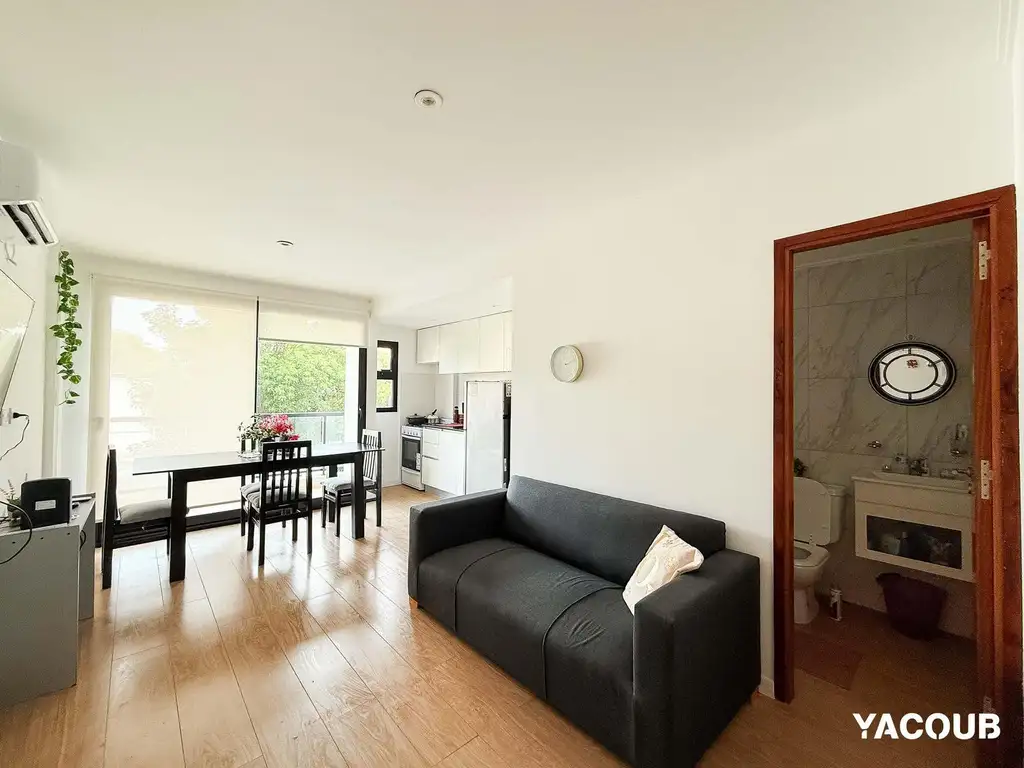 _ El mismo posee cocina equipada con muebles sobre y bajo mesada, living, comedor, un dormitorio con placard y un baño completo. Amplio y luminoso, cuenta con balcón y equipo de aire acondicionado.
