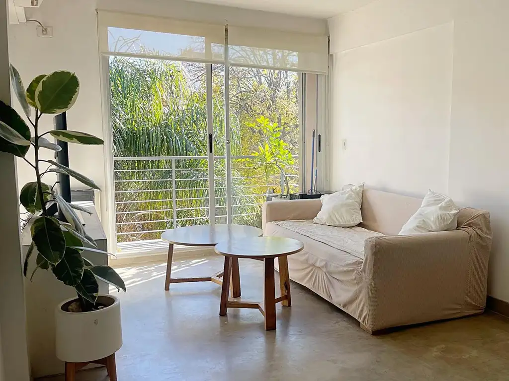 Amplio living comedor de 8 x 3,10 m con salida al balcón