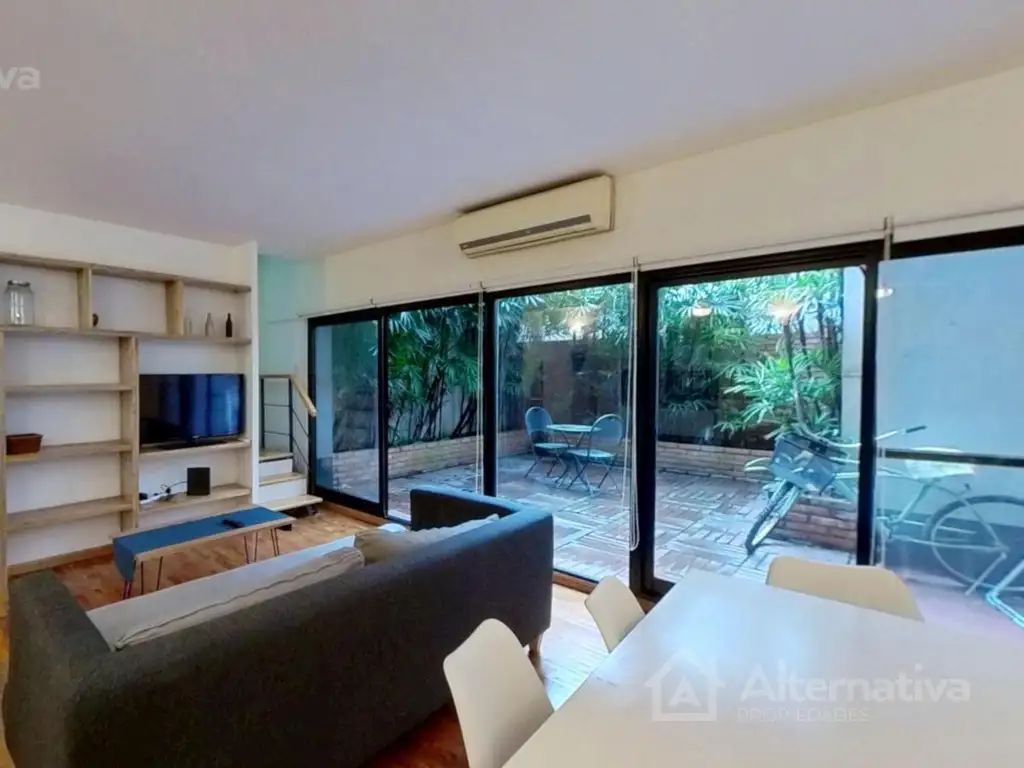 Al departamento se ingresa por el living comedor, amplio con salida al patio propio. En la primer planta se encuentra la cocina integrada al ambiente, con lugar para lavarropas y horno a gas con extractor instalado. Cuenta con toilette de recepción y aire acondicionado frio/calor.