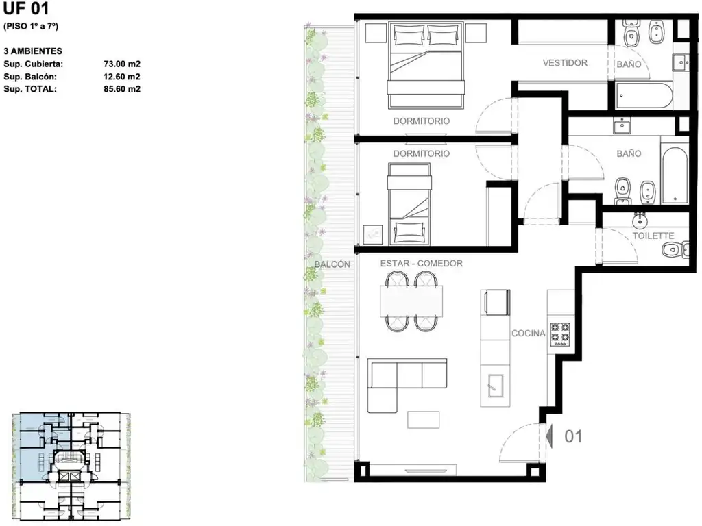 living comedor con cocina incorporada toillete de recepcion balcon corrido al frente