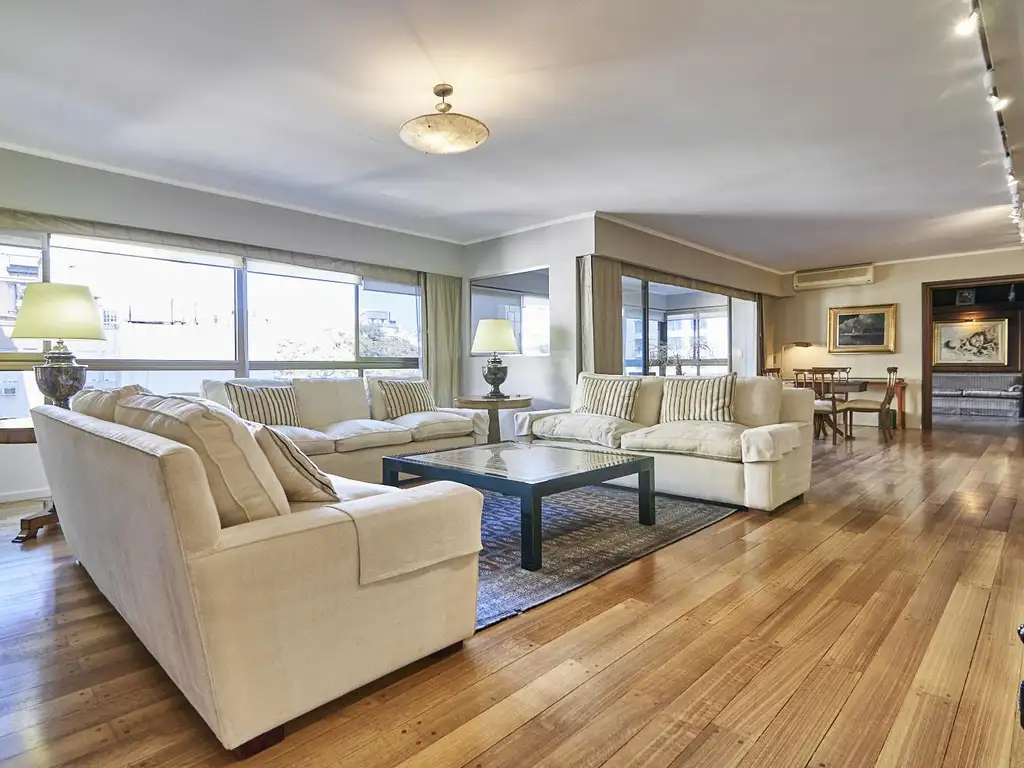 Gran recepción, escritorio con vistas a los jardines de la Nunciatura y comedor separado con doble puerta. Sector de toilette con placard de recepción.