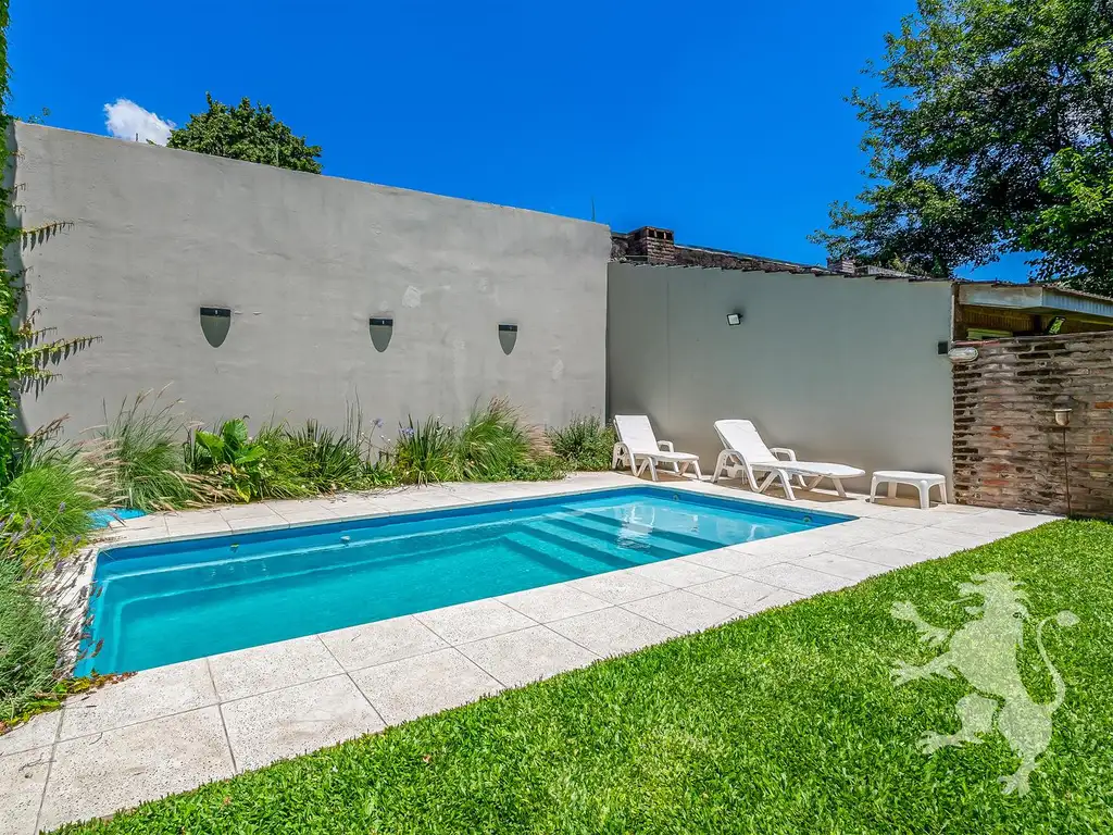 Hermoso jardín con pileta y parrilla - Amplia sala de estar con hogar - Suite con acceso independiente con conexión a patio interno - Hall de distribución - Suite con ducha en baño (Ventilación natural) - Baño completo con bañera - Cocina concepto abierto integrada a comedor principal, con vista al jardín- Cochera para 2 vehículos - Dependencia de servicio - Lavadero - Cuarto de herramientas