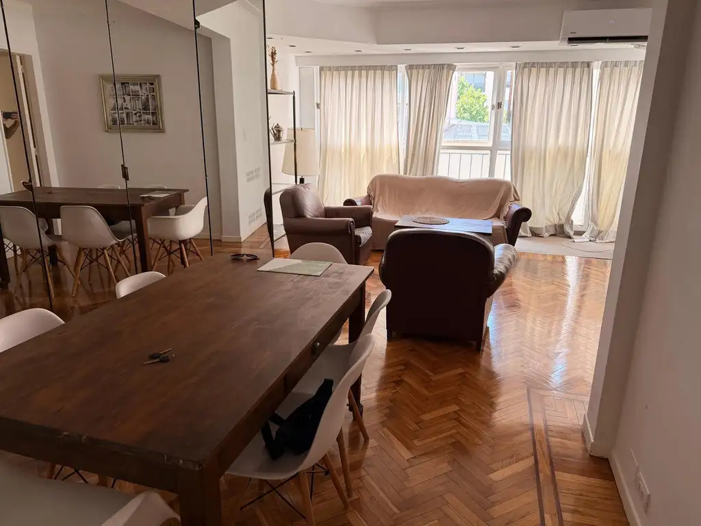 El living comedor, de muy buenas dimensiones, cuenta con pisos de parquet y un sector que antiguamente funcionaba como balcón y hoy se encuentra integrado al ambiente, generando mayor amplitud y luz natural. Existe la posibilidad de volver a su estado original y recuperar el balcón descubierto. Un gran placard de profundidad suma espacio de guardado ideal para despensa.