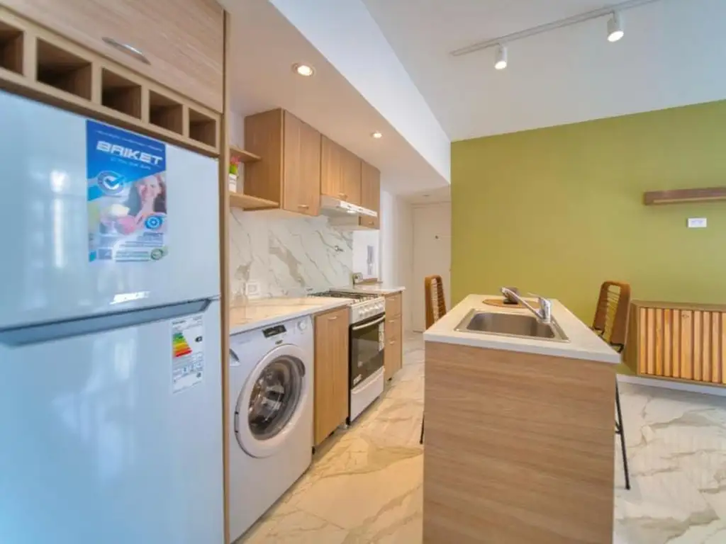 El ambiente principal deslumbra con una moderna cocina integrada, equipada con isla, banquetas, heladera, cocina a gas, alacena y bajomesada. El área de estar incluye sillón, mesa ratona y rack TV.