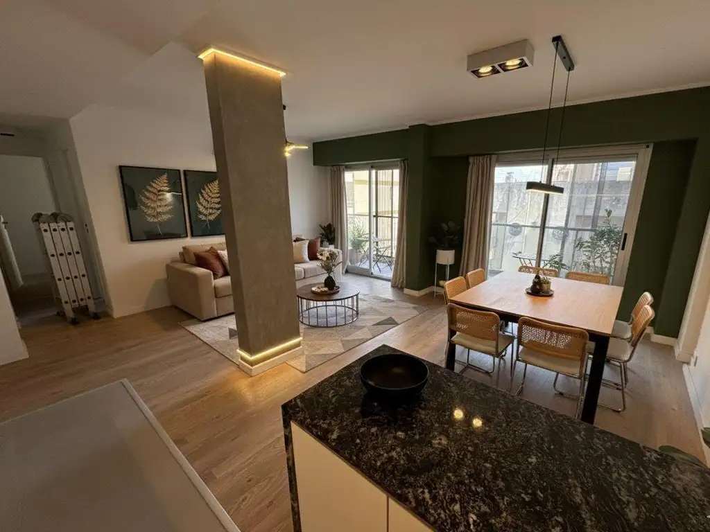 Terminaciones: Pisos de ingenieria en living comedor y dormitorios, porcelanatos en cocina y balcón, mesada de marmol negra brasil, cocina revestida en porcelanatos, anafe separado y horno empotrado, campana extractor, alacenas y bajo mesada en mdf, aberturas DVH (doble vidrio).