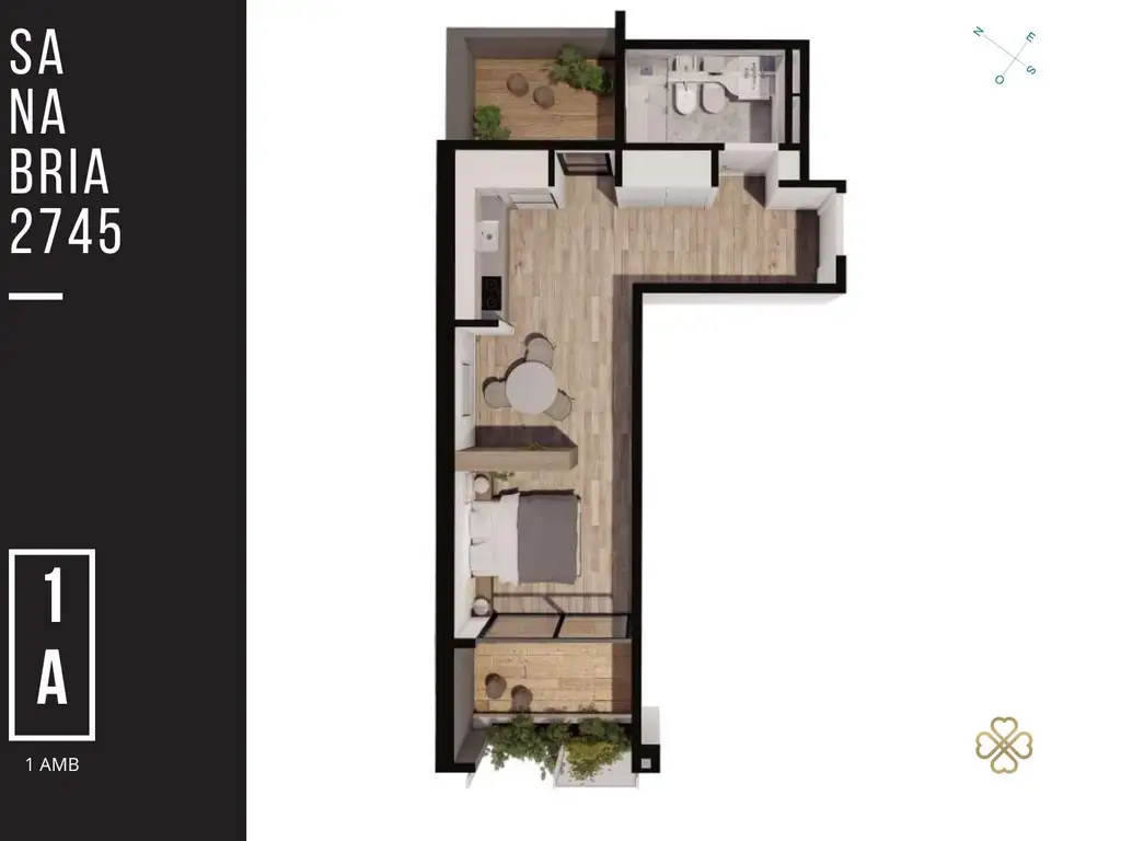 La unidad: departamento monoambiente de 45.60m2 totales, con un amplio balcón de 6m2 al frente y un patio de 5m2 al contrafrente. Cuenta con cocina integrada, estar y baño completo.