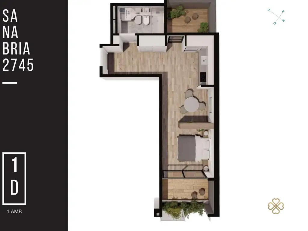 La unidad: departamento monoambiente de 44.70m2 totales, con un balcón de 6m2 al frente y un patio de 5m2 al contrafrente. Cuenta con cocina integrada, estar y baño completo.