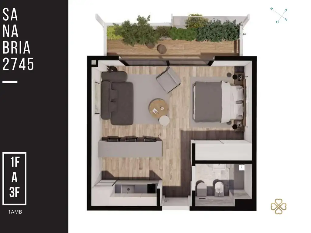 La unidad: departamento monoambiente de 37m2 totales, con balcón al contrafrente de 7m2. Cuenta con cocina integrada, estar y baño completo.