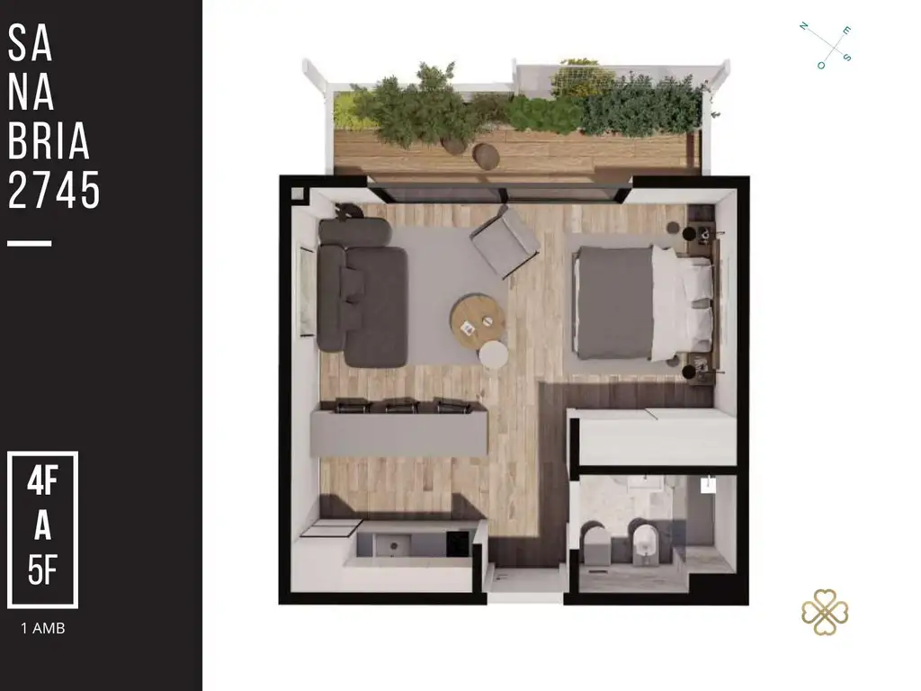 La unidad: departamento monoambiente de 37m2 totales, con balcón al contra frente de 7m2. Cuenta con cocina integrada, estar y baño completo.
