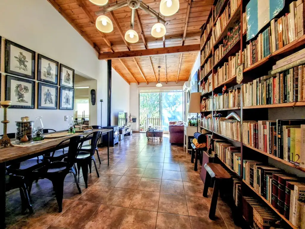 El ingreso conduce a un toilette de recepción y luego a un amplio living comedor, con salida a balcón principal, ideal para disfrutar del verde que rodea al complejo. El espacio principal cuenta con salamandra marca Tromen, que además de calefaccionar, aporta carácter y una fuerte impronta de hogar. Una biblioteca de piso a techo, diseñada a medida, acompaña el ambiente y realza la calidad de los materiales.