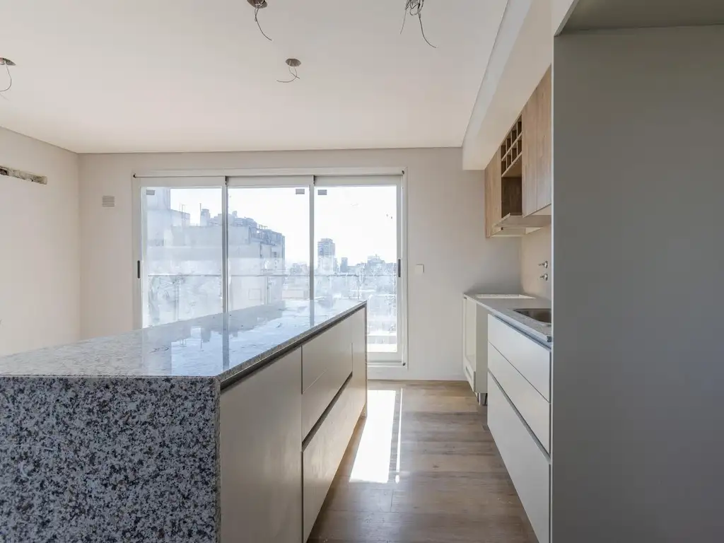 - Cocina integrada al living comedor, mesada de granito, isla central con mueble y tapa de granito en cascada, alacena y bajo mesada.