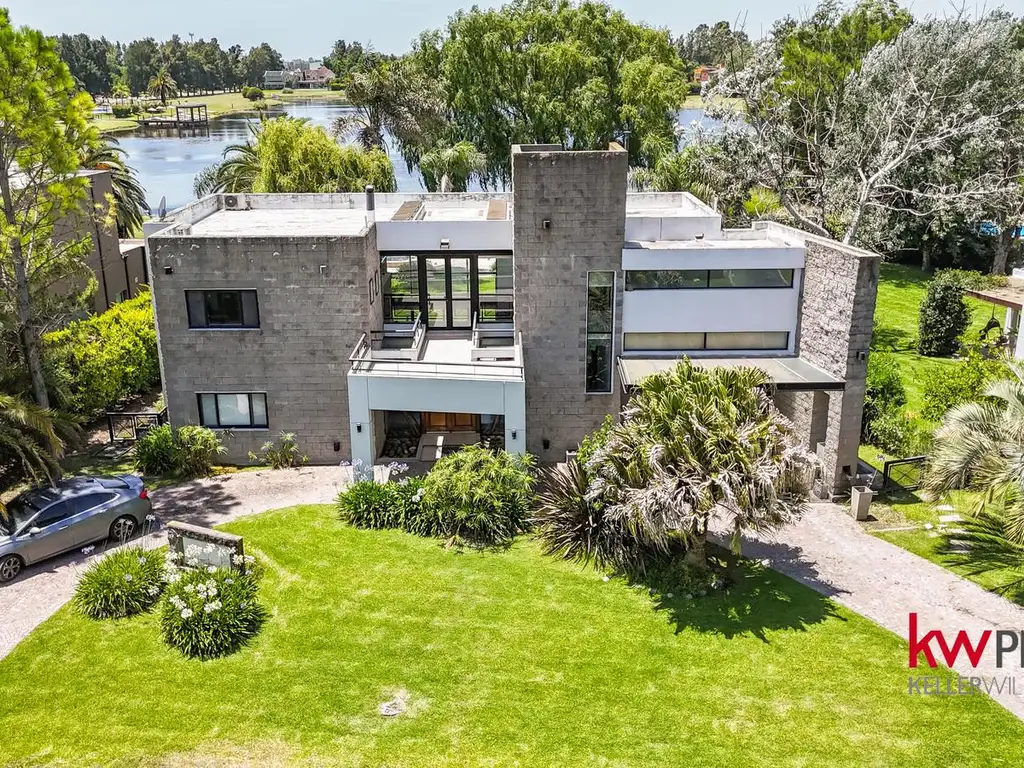 Se destaca el jardín de invierno integrado, que incluye parrilla y se conecta con el jardín y la pileta, generando una transición fluida entre interior y exterior, con vistas abiertas al agua.