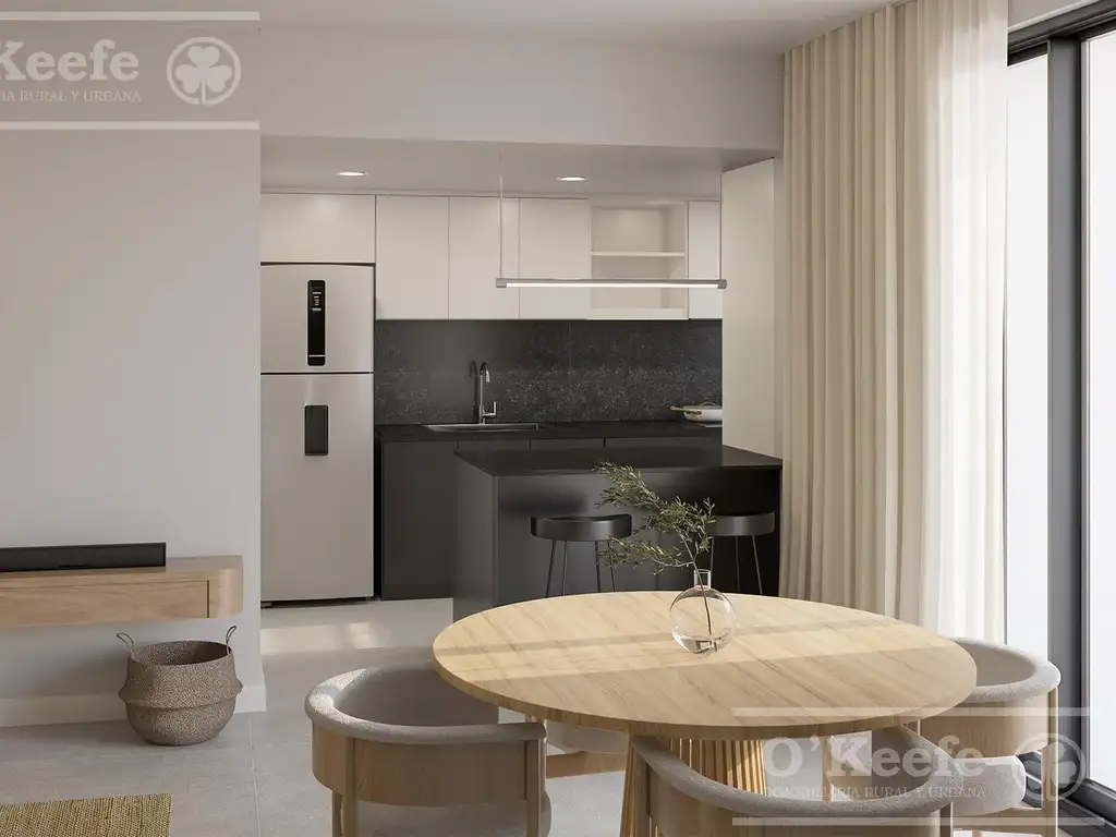 La cocina es moderna y está equipada con materiales de alta resistencia como Purastone o similar en las mesadas. Los dormitorios (3.30 x 3.00 y 2.85 x 2.80) cuentan con placares integrados. Calidad constructiva con pisos de porcelanato y carpinterías de aluminio con DVH.