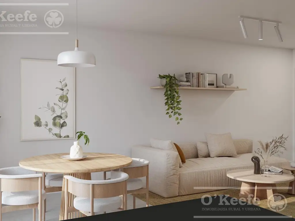 El living/comedor (6.97 x 4.00) se conecta al balcón exterior. La cocina es independiente y está equipada con mesadas de Purastone y muebles de melamina sobre MDF. Calidad constructiva con pisos de porcelanato y carpinterías de aluminio con DVH.