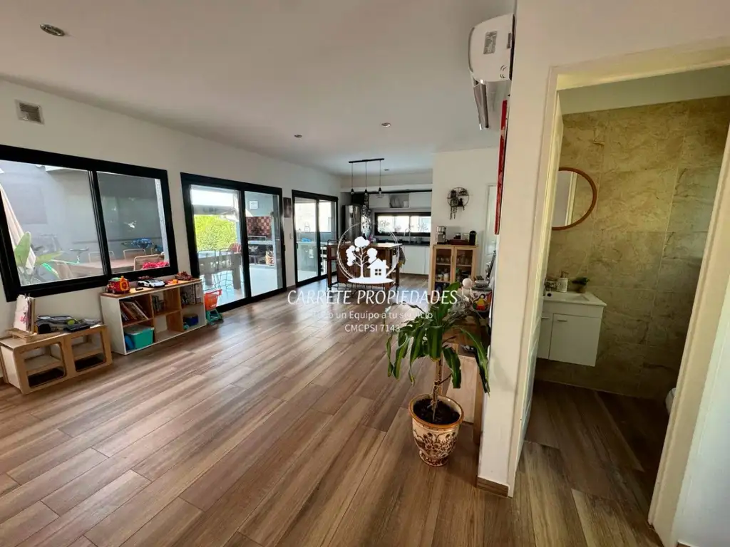 DISTRIBUCIÓN: Hall de ingreso y toilette de recepción. Amplio living al frente con cocina americana integrada, isla central, doble circulación y extensa mesada. Lavadero independiente con ingreso de servicio. Playroom abierto con vista a la galería, adaptable como dormitorio de huéspedes.