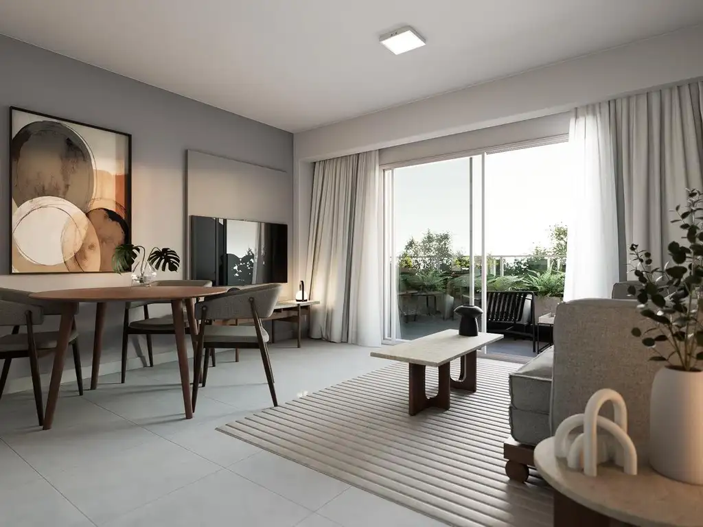 Las grandes aberturas con carpinterías de aluminio y vidrios DVH aseguran excelente entrada de luz natural y aislamiento térmico y acústico. El balcón aporta una expansión ideal para disfrutar del exterior, sumar ventilación y mejorar la calidad del espacio interior.
