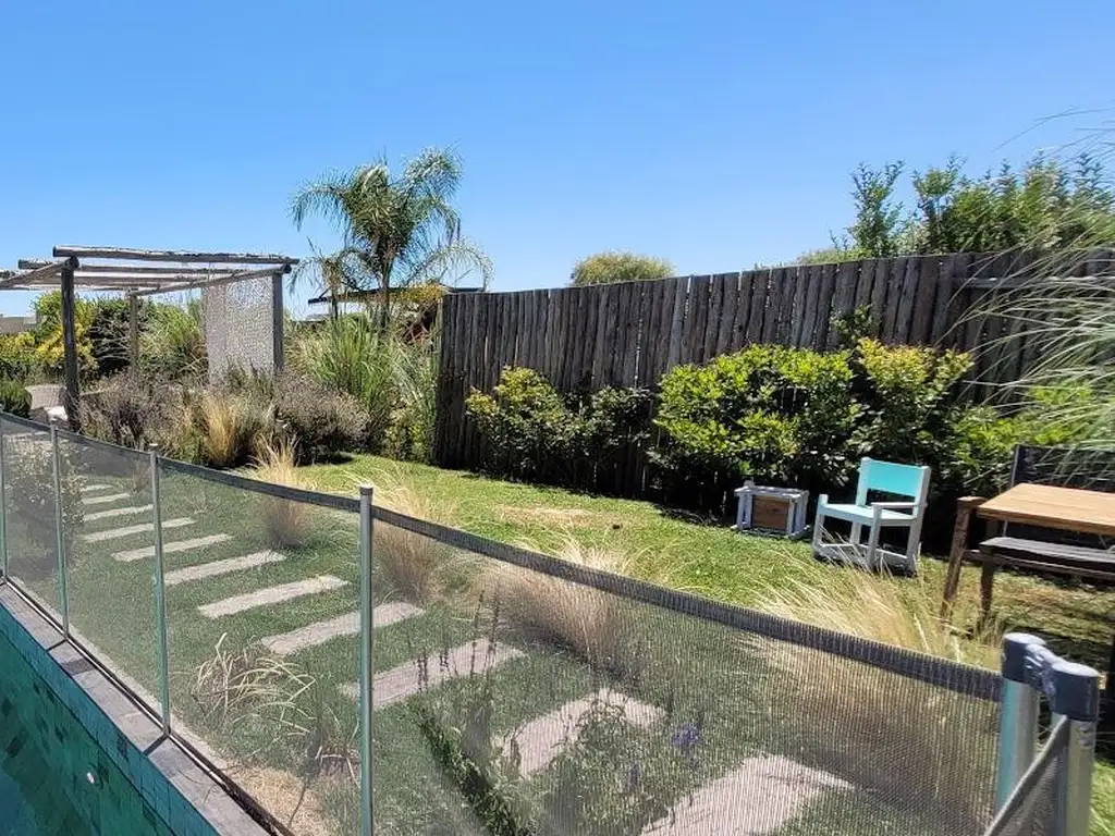 En su Exterior, una Pileta de grandes dimensiones revestida en Piedra Bali, y con Cerco para niños. Todo parquizado con Diseño, con Pergola para su uso , cerca de la pileta.