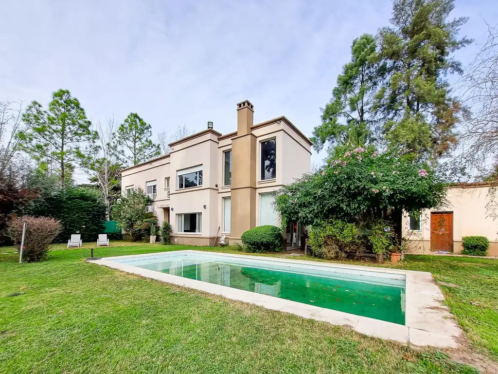En la parte exterior: El parque es de destacar. Posee un desarrollo paisajistico que integra arbustos, arboles y un parquizado de alta calidad. Cochera para 2 autos. Parrilla, lavadero con baño exterior, Piscina.