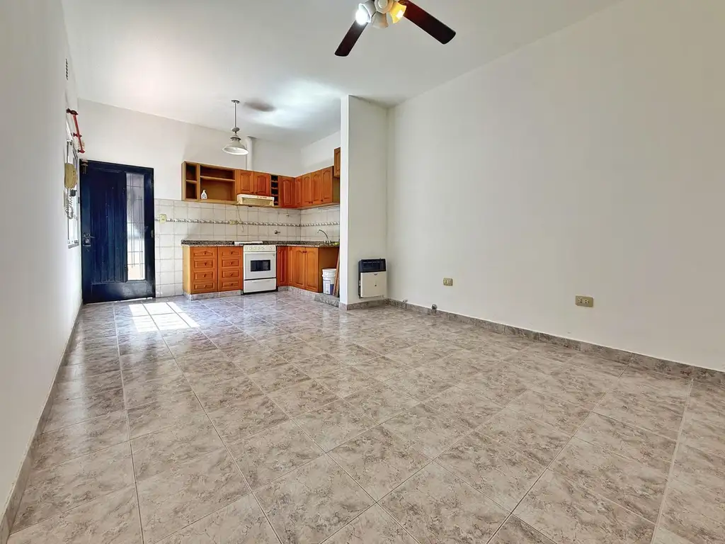 Amplio living comedor, cocina semi integrada equipada con muebles de alacenas y bajo mesadas.