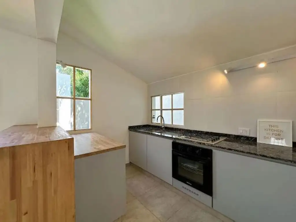 La propiedad cuenta con un amplio living comedor, toilette de recepción y cocina semi integrada equipada con horno y anafe diferenciados. Tanto el living como la cocina se conectan con un hermoso patio con césped de 36 m2, orientación norte y parrillero.