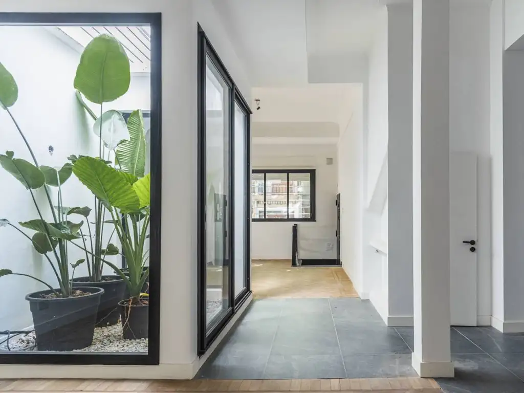 Comedor integrado a cocina de concepto abierto, ambos con salida a patio interno con verde.