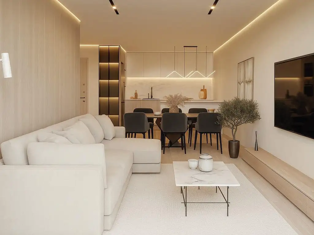 El área social integra living, comedor y cocina en un ambiente amplio y luminoso, con salida a un balcón que aporta expansión exterior y una conexión directa con el aire libre.