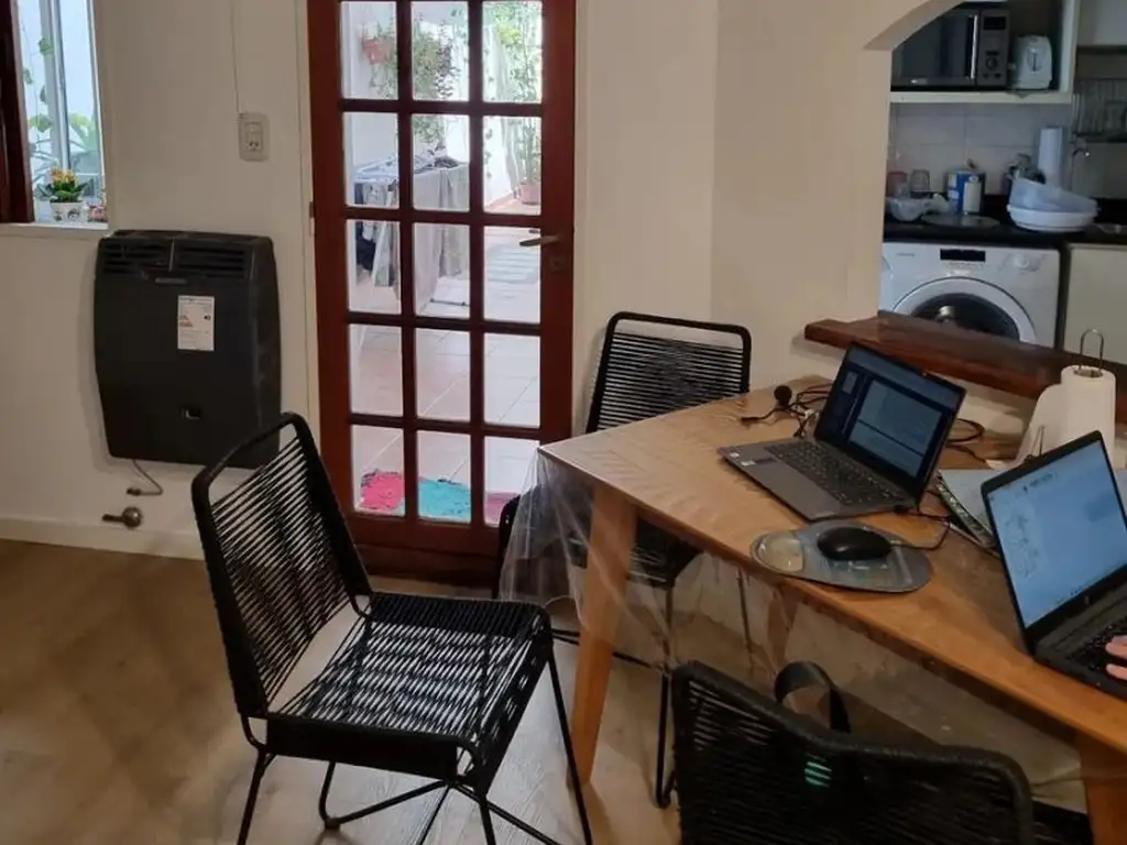 Gran living con barra desayunadora, acceso al patio, a la cocina, a un toilette y a una baulera. El living cuenta con una estufa tiro balanceado nueva y un aire acondicionado frio calor.