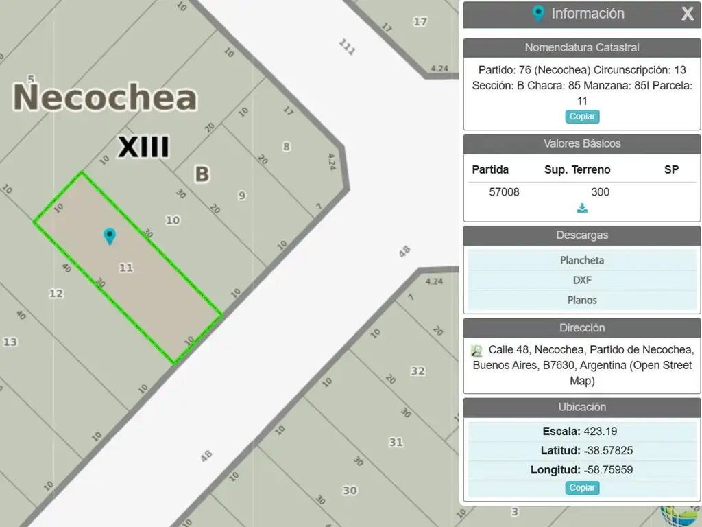 Partido: 76 (Necochea) Circunscripción: 13 Sección: B Chacra: 85 Manzana: 85I Parcela: 11