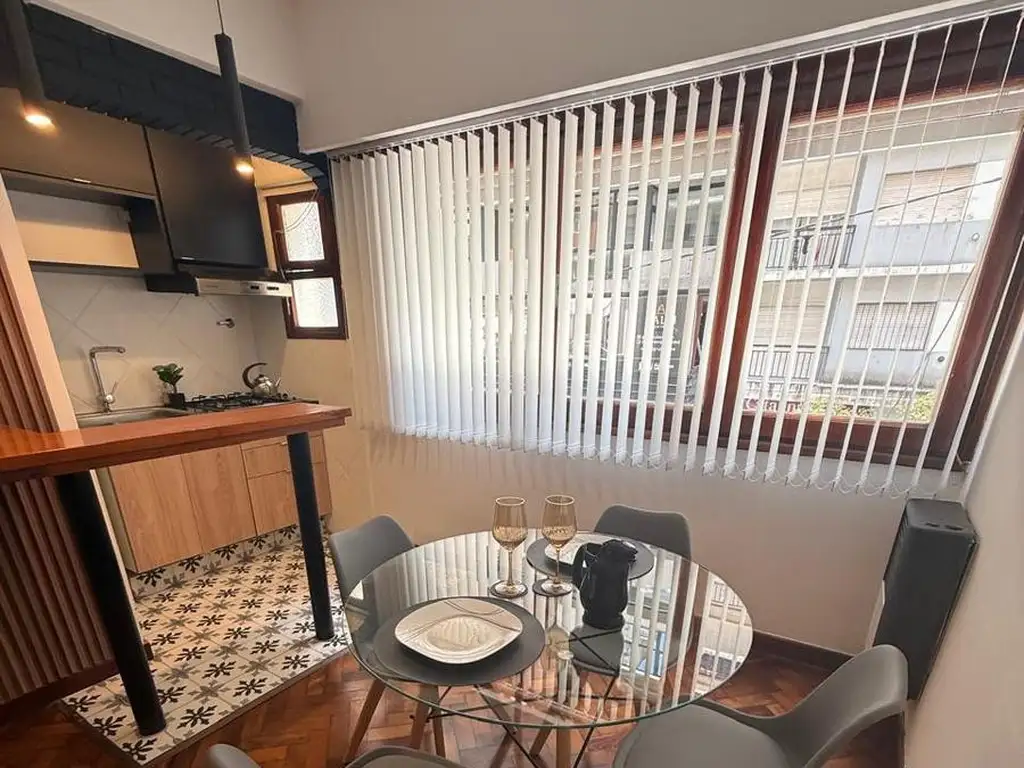 Al ingresar, el ambiente se presenta cómodo y bien aprovechado, con una cocina integrada que suma una barra desayunadora, aportando practicidad y una circulación fluida.