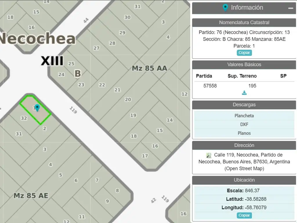 Datos catastrales: Partido: 76 (Necochea) Circunscripción: 13 Sección: B Chacra: 85 Manzana: 85AE Parcela: 1