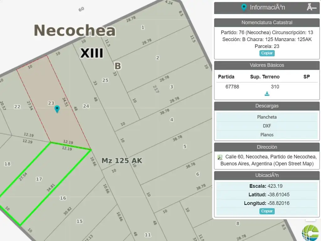 Partido: 76, Circunscripción: 13, Sección: B, Chacra: 125, Manzana: 125AK, Parcela: 17 y 23, Partidas 67782 y 67788.