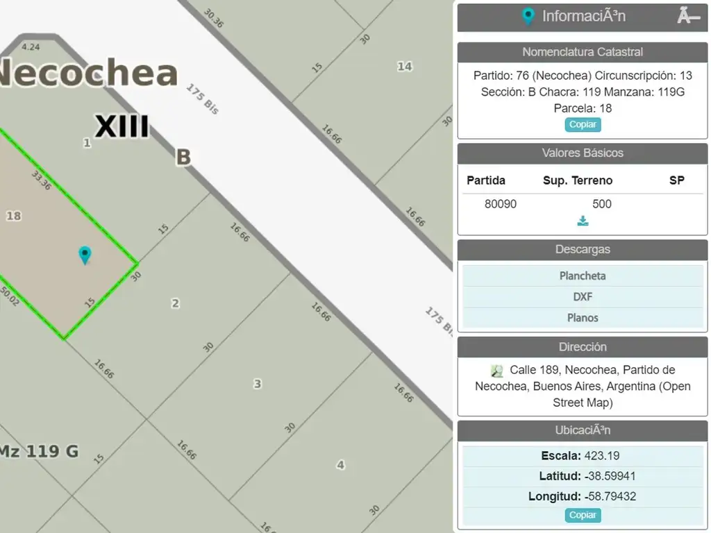Gran lote en venta en Villa Los Delfines, Necochea, Prov. de Bs. As. sobre Av. 58 (Blvd. Sarmiento), entre calles 175 y 175bis, de 500m2, Partido: 76 (Necochea) Circunscripción: 13, Sección: B, Chacra: 119, Manzana: 119G, Parcela: 18, Partida: 80090.