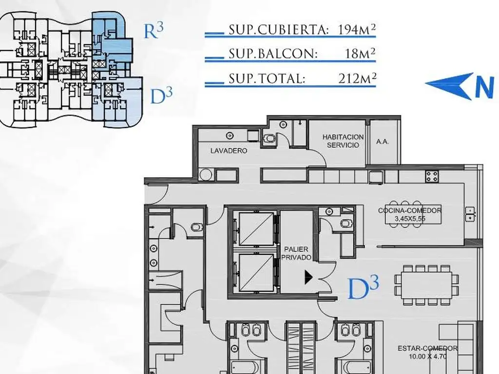Superficie: 212m2 totales (194m2 cubiertos y 18m2 de balcón aterrazado). Incluye una cochera fija en el precio. Cuenta con un amplio living-comedor, 3 dormitorios en suite (el principal con vestidor), toilette de recepción, cocina independiente con comedor diario, lavadero y dependencia de servicio. Palier privado.