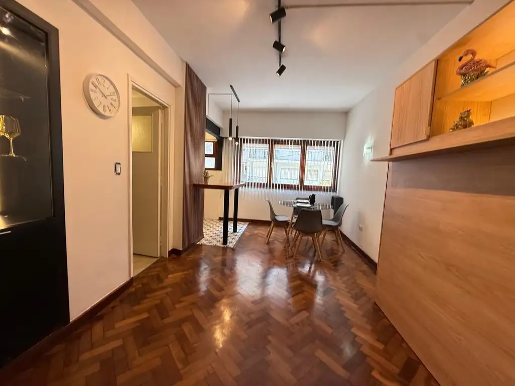 El departamento es de 1 ambiente a la calle, completamente remodelado, con una superficie aproximada de 26 m². Presenta un ambiente principal luminoso, con piso de parquet hidro laqueado en excelente estado y carpintería nueva, lo que aporta calidez y una estética moderna.