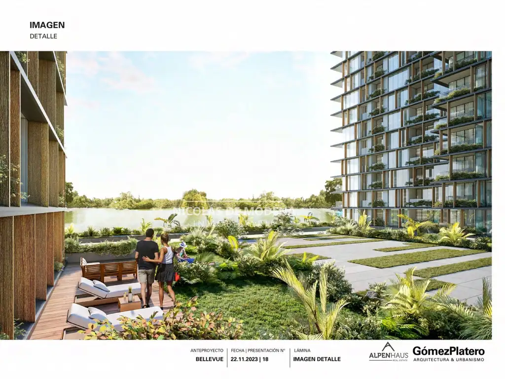 El proyecto incorpora un jardín verde elevado y amplios espacios exteriores que dialogan con la vasta extensión del cuerpo de agua. La vista se abre hacia el lago y también hacia el paisaje rural de Canelones, creando una sensación de amplitud y serenidad que acompaña cada momento del día.