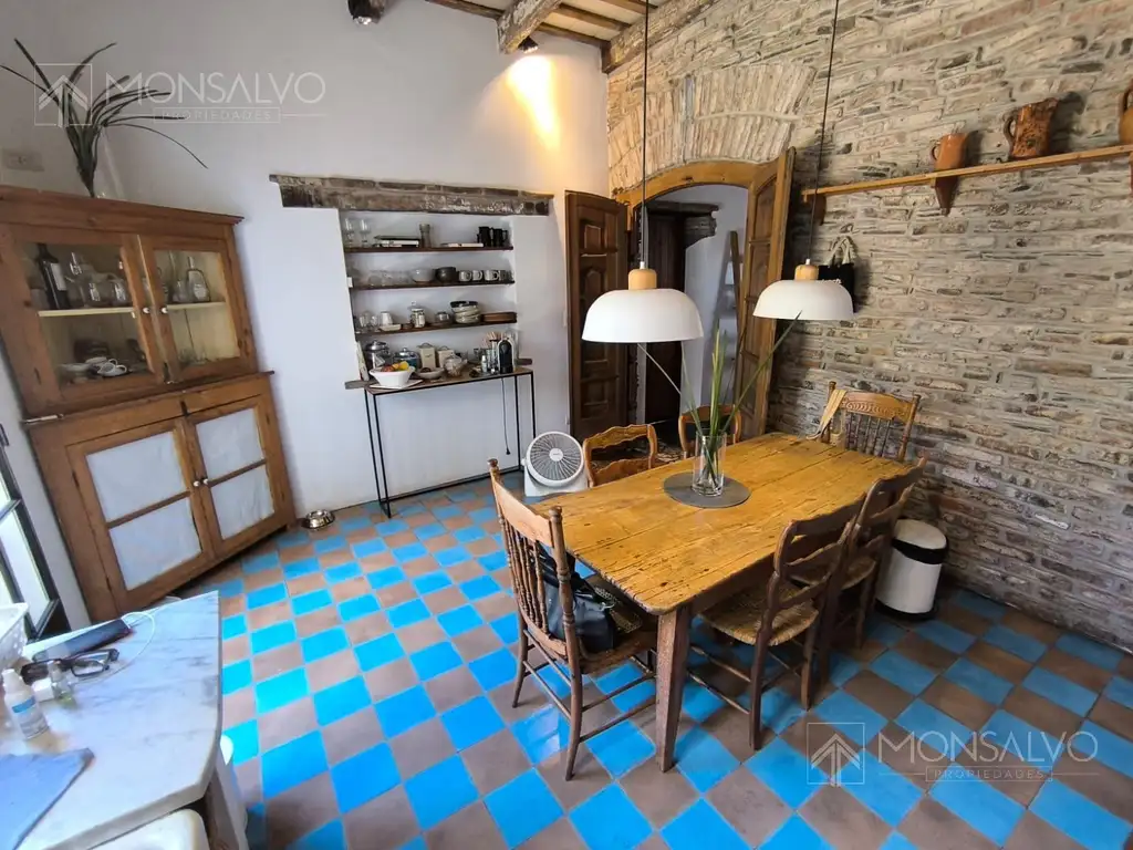 Mención especial: El baño principal, recientemente renovado, es un refugio de diseño con bacha de piedra tallada, grifería de bronce y un tragaluz que baña el espacio de luz natural sobre un piso de cemento alisado con incrustaciones de teja.