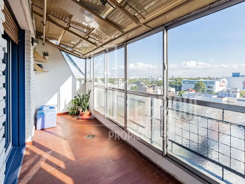 Living-comedor con aire acondicionado frio-calor. Puerta balcon con persiana de madera al exterior. Balcón terraza con cerramiento, vista abierta, conexión para lavarropas y bacha. La unidad se encuentra en un 8vo piso (orientación Oeste).