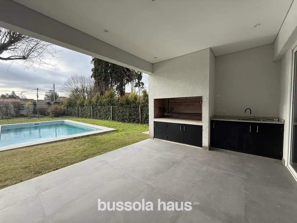 El exterior cuenta con jardín parquizado y pileta de 4 x 8 metros con playa húmeda, revestida en venecitas importadas, además de espacio de estacionamiento para varios autos.
