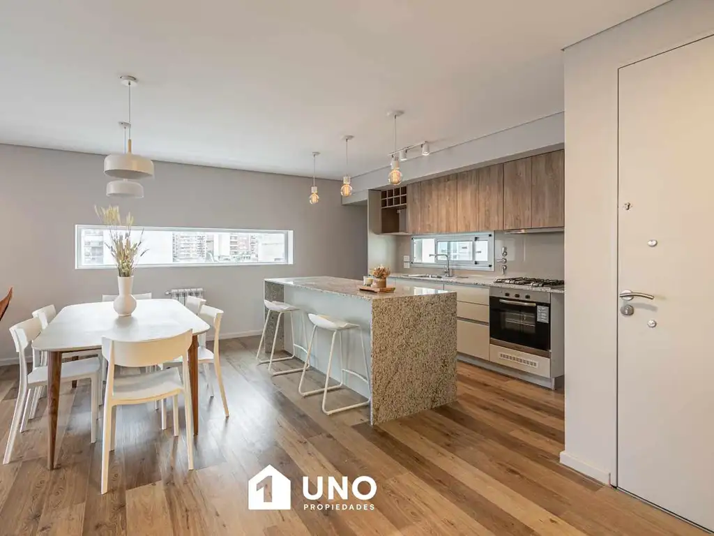 La unidad se desarrolla a partir de un amplio estar/comedor con salida directa al balcón terraza al frente, integrado a la cocina mediante una isla central con barra desayunadora.